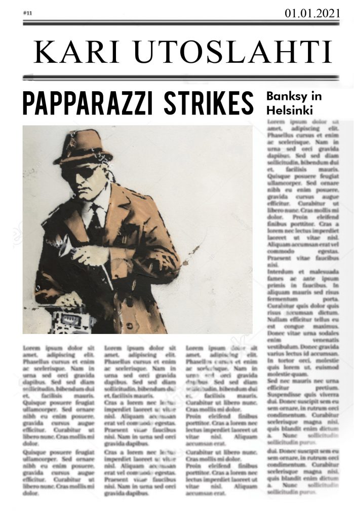 The first novel features Papparazzi, who is a paparazzo and grandpa in the same package. The hero in always on site when things happen. He rewrites the front pages and scoops. As a comical figure he is unique – even in a worldwide scale. Banksy in Helsinki story has the approval of the world- famous artist.